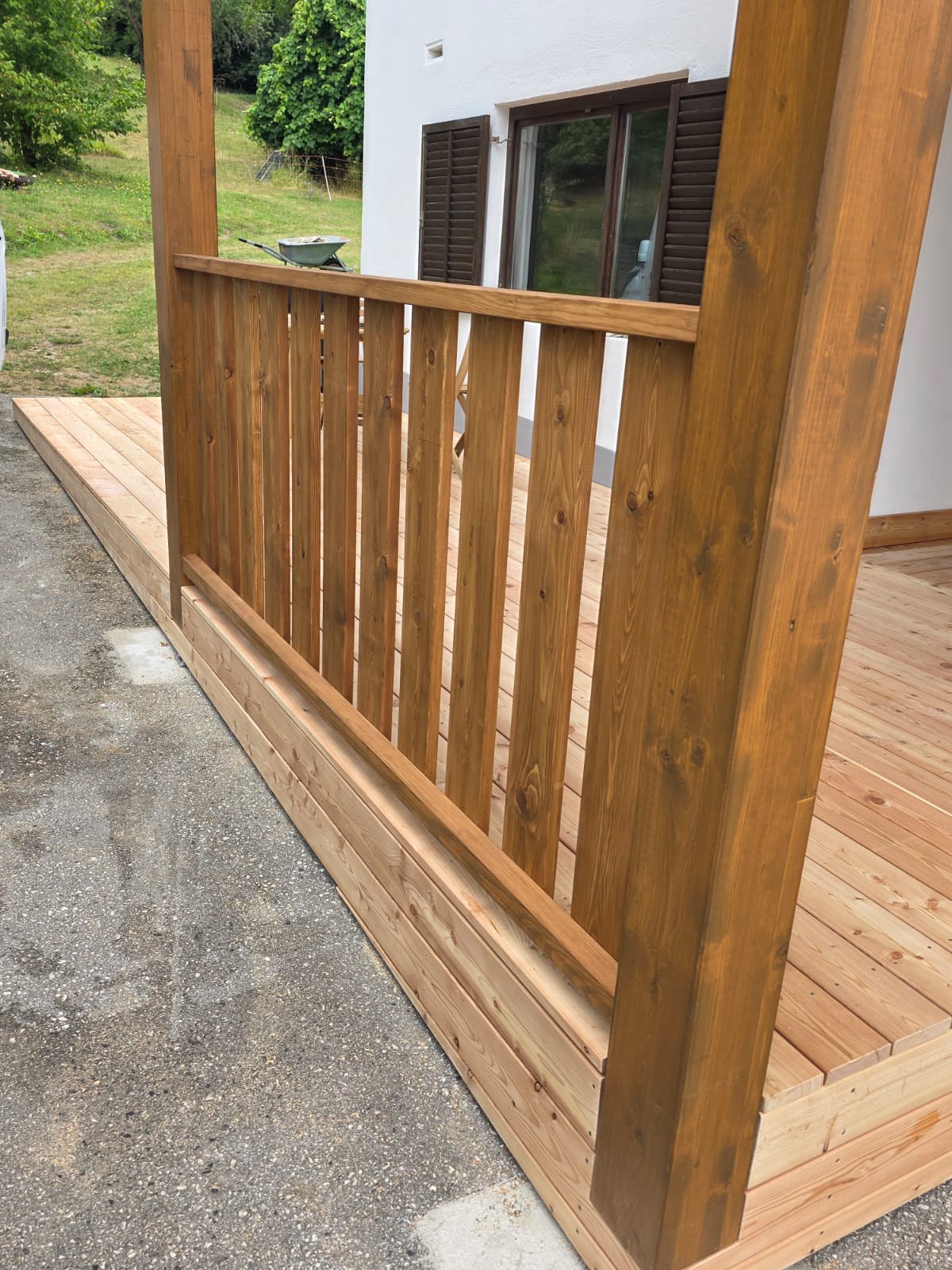 Das Holz wurde sorgfältig ausgewählt, präzise verarbeitet und widerstandsfähig veredelt – für eine lange Lebensdauer und ein harmonisches Gesamtbild. Durch die individuelle Planung passt sich die Konstruktion perfekt an die Architektur des Hauses an und bietet sowohl praktischen Nutzen als auch optische Aufwertung.